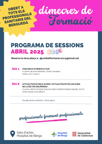 A la imatge i document adjunts ja podeu consultar les sessions d'abril dels Dimecres de Formació, obertes a tots els professionals sanitaris del territori.