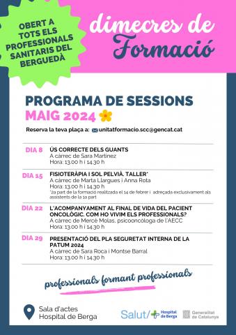 Aquí teniu les propostes dels Dimecres de Formació de l'Hospital de Berga per al mes de maig. Obertes a tots els professionals de salut. Reserva la teva plaça a unitatformacio.scc@gencat.cat.