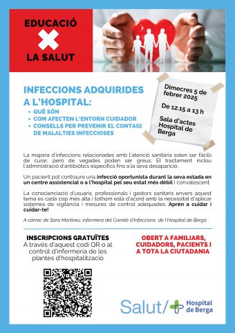 El dimecres 5 de febrer a les 12.15 h, tindrà lloc una nova sessió d'Educació per la salut a l'Hospital de Berga, oberta a tota la ciutadania Parlarem sobre "Infeccions adquirides a l'hospital: què són, com afecten l'entorn cuidador i consells per prevenir el contagi de malalties infeccioses". Pots reservar la teva plaça en aquest formulari.