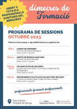 L'Hospital de Berga ha obert els Dimecres de Formació a tots els professionals sanitaris del Berguedà: Atenció Primària, residències... Es tracta de píndoles formatives de curta durada, impartides per professionals del nostre centre, per fer arribar actualitzacions, novetats i informació de diferents àmbits a altres professionals del sector. En la imatge adjunta podeu veure les propostes per al mes d'octubre.