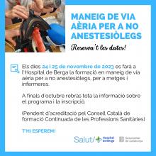 L'Hospital de Berga organitza la segona edició de la formació Maneig de via aèria per a no anestesiòlegs, adreçat a personal sanitari que tingui relació i/o estigui interessat en el coneixement i maneig de la via aèria, especialment metges i infermeres d'urgències i emergències així com personal de cures intensives. Serà els dies 24 i 25 de novembre. Ben aviat us donarem informació detallada de les jornades.