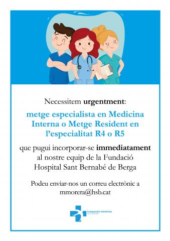 Per fer front a la situació excepcional que estem vivint, a la Fundació Hospital Sant Bernabé necessitem incorporar un metge especialista en Medicina Interna o Metge Resident en l'especialitat R4 o R5. Si hi esteu interessats i podeu sumar-vos al nostre equip de manera immediata, envieu un correu electrònic a mmorera@hsb.cat.