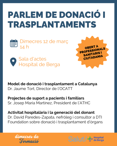 Xerrada sobre donació i trasplantaments a l'Hospital de Berga, oberta a professionals sanitaris i ciutadania: Dimecres 12 de març a les 14 h. Amb professionals d'entitats de reconegut prestigi com l'Organització Catalana de Trasplantaments, l'Associació de Malalts i Trasplantats Hepàtics i DTI Foundation. Sessió inclosa dins el programa "Dimecres de Formació" de l'Hospital de Berga.