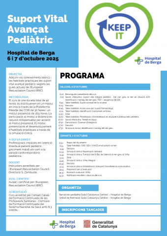 Aquest mes d'octubre tindrà lloc la primera edició del curs de Suport Vital Avançat Pediàtric, organitzat per l'Hospital de Berga. La proposta ha tingut un gran èxit i ha exhaurit places ràpidament. Per això, ja estem preparant la segona edició, us informarem properament.