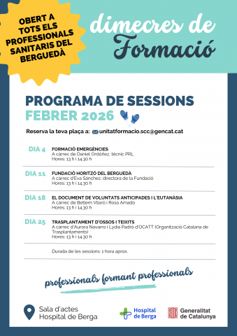 A la imatge i al document adjunt, podreu consultar les sessions formatives del mes de febrer. El programa "Dimecres de formació" està obert a tots els professionals sanitaris del territori i ofereix setmanalment píndoles breus sobre temes d'interès per al sector.